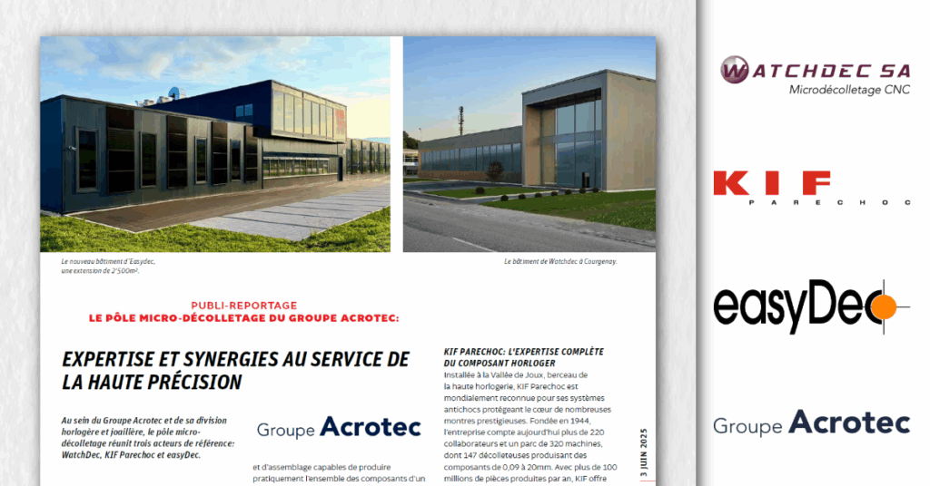 Lors de l’édition 2025 du salon EPHJ, les sociétés easyDec, KIF Parechoc et Watchdec, toutes trois membres du Groupe Acrotec, ont été mises en avant dans un publi-reportage publié dans le magazine quotidien officiel du salon. Ce contenu met en lumière les compétences spécifiques de ces trois entités réunies au sein du pôle micro-décolletage de la division horlogère et joaillère du Groupe.